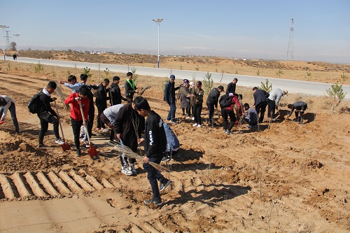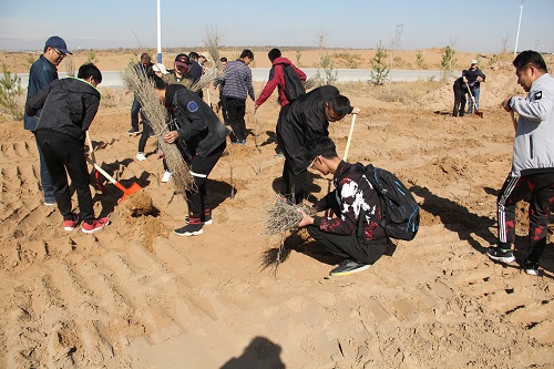 活动中,彩旗飘飘,人头攒动,在学院党总支书记贺军的带领下,师生党员及入党积极分子冒着风沙、顶着烈日、躬身挖坑、俯身扶苗、挥锨填土、双脚踩实……参与植树活动的师生们互助协作、配合默契,热情高涨、干劲十足,每一道工序都做得一丝不苟,欢声笑语不断,将一棵棵充满希望和生机的树木植入地里,为荒漠增添一份新绿,劳动现场热火朝天。此次活动,机械工程系党总支共栽下了沙枣树1000余株,为浩瀚的腾格里沙漠增添了一道亮丽的色彩。